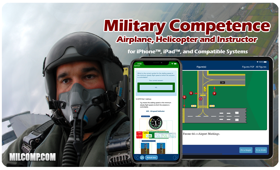 Our iPhone™/iPad™ test preps for Military Competence Non-Specific (MCN) written test (Covers Airplane, Helicopter, and Powered Lift pilots), and Military Competence Instructor (MCI) that will